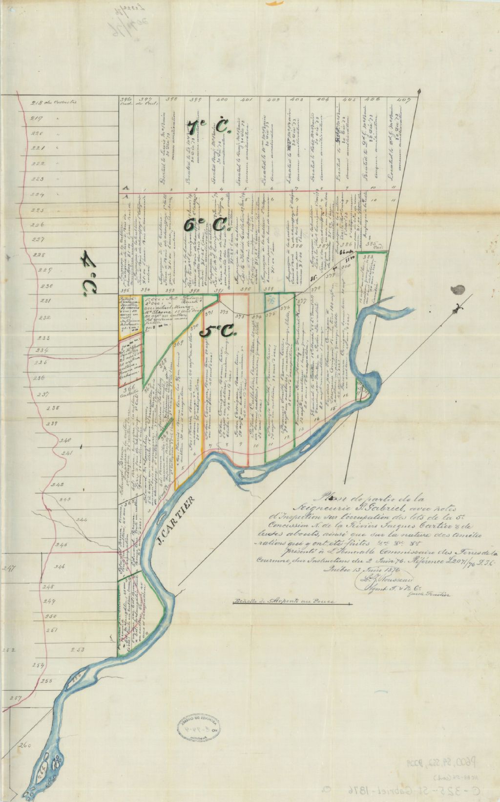 Sur ce plan d'une partie de la seigneurie Saint-Gabriel figurent une partie de la rivière Jacques-Cartier, le numéro et la dimension des lots, la nature du sol, les chemins, les bâtiments, les îles et le nom des propriétaires.La précédente cote de ce plan est: C325-Saint-Gabriel-1876 O