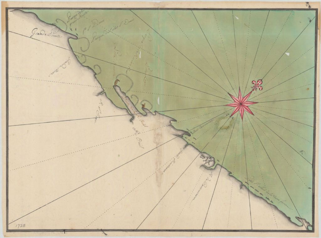 Carte désignant l'endroit où se faisait la pêche aux marsouins dans une partie du fleuve Saint-Laurent. On peut y voir la rivière Ouelle, la pointe de la Rivière Ouelle, la rivière aux Perles ou Kamouraska, l'anse Sainte-Anne, les îles de Kamouraska, un moulin, un bâtiment, le site de fréquentation des bélugas et l'emplacement de la pêche à la fascine.La précédente cote de ce plan est: B913-Saint-Laurent-1728 O fo.1