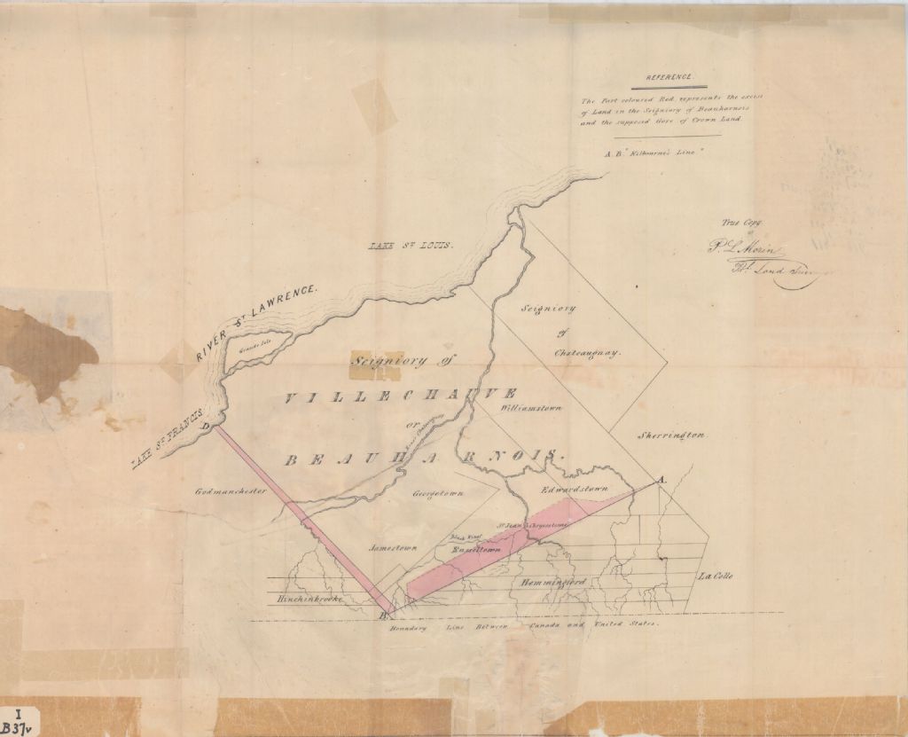 Sur ce plan de la seigneurie de Beauharnois figurent les lacs Saint-Louis et Saint-François, une partie du fleuve Saint-Laurent, la rivière Châteauguay, les villages, les rivières et les ruisseaux. On retrouve également une légende.La précédente cote de ce pan est: B325-Beauharnois-vers 1850 o