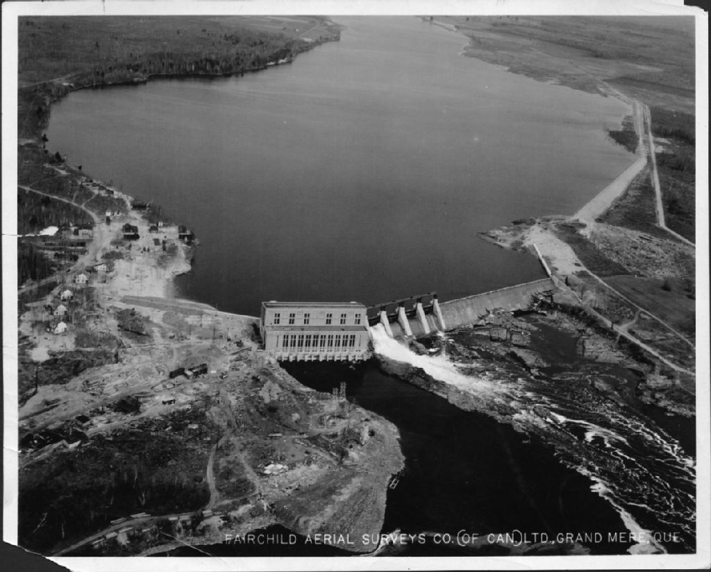 Sur cette photographie aérienne de Drummondville, on voit le barrage de la chute Hemmings, comté Drummond
