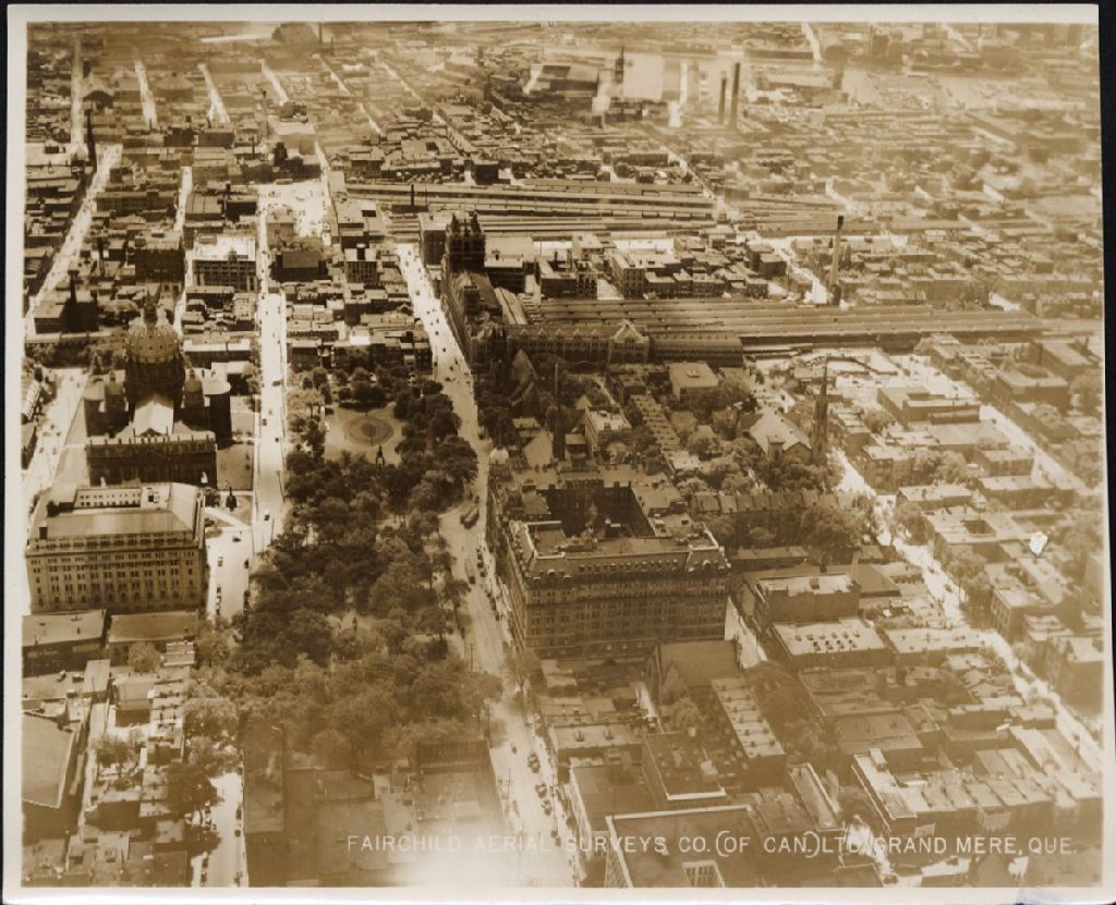 Sur cette photographie aérienne de Montréal, on voit une partie de la ville, l'hôtel Windsor, l'hôtel Queen, l'église Saint-Jacques et ls gares Windsor et Bonaventure