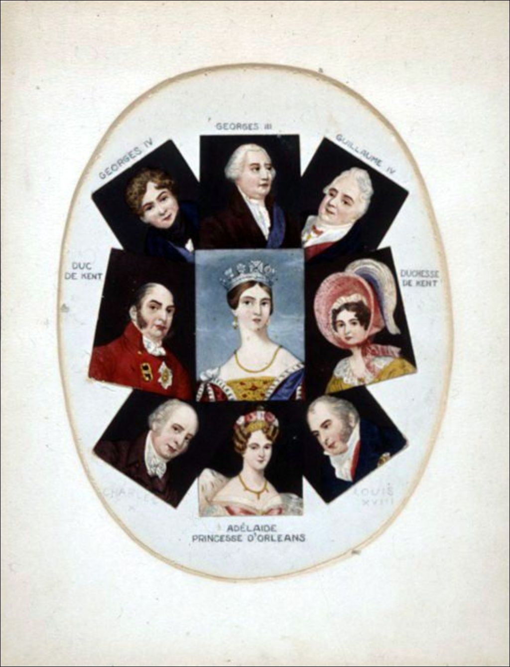 George IV; George III; Guillaume IV; Duc de Kent; Duchesse de Kent; Charles X; Adélaïde d'Orléans; Louis XVIII, [vers 1850], Archives nationales à Québec, Collection initiale, (03Q,P600,S5,PAQ82), Photographe non identifié.