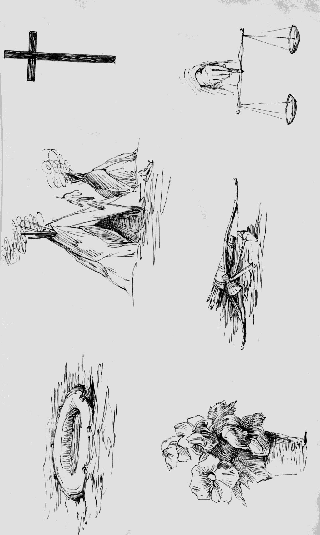 Bouée, tipis, croix, fleurs, flèches, balance