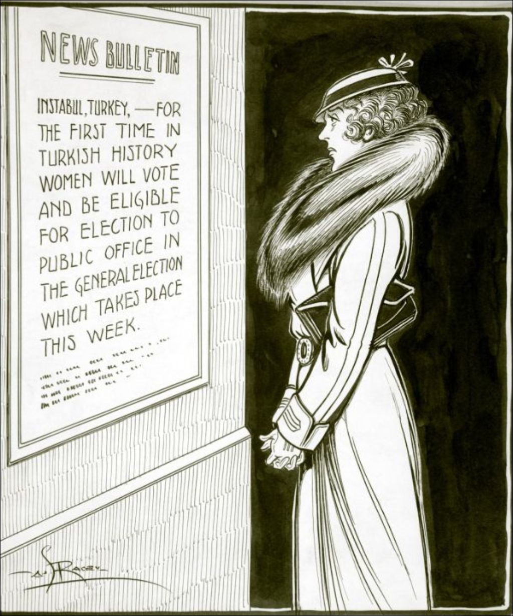 "News bulletin: for the first time in turkish history women will vote and be eligible to the public office in the general election which takes place this week", [vers 1930], Archives nationales à Québec, Collection initiale, (03Q,P600,S5,PDEN59), A.G. Racey.