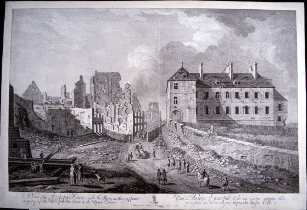 Vue du Palais épiscopal et des ruines, comme elles paraissent sur la montagne, depuis la Basse-Ville, Québec, [vers 1770], Archives nationales à Québec, Collection initiale, (03Q,P600,S5,PGN41), Photographe non identifié.