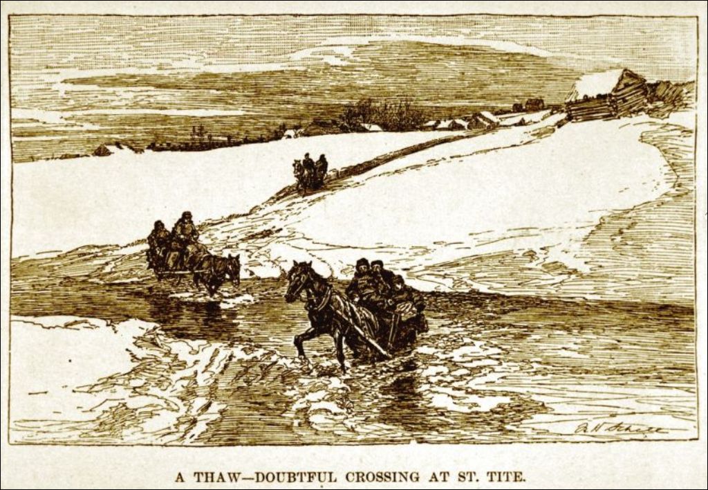 Winter in Canada, scenes from «Harper's Weekly»; A thaw-doubtful crossing at Saint-Tite