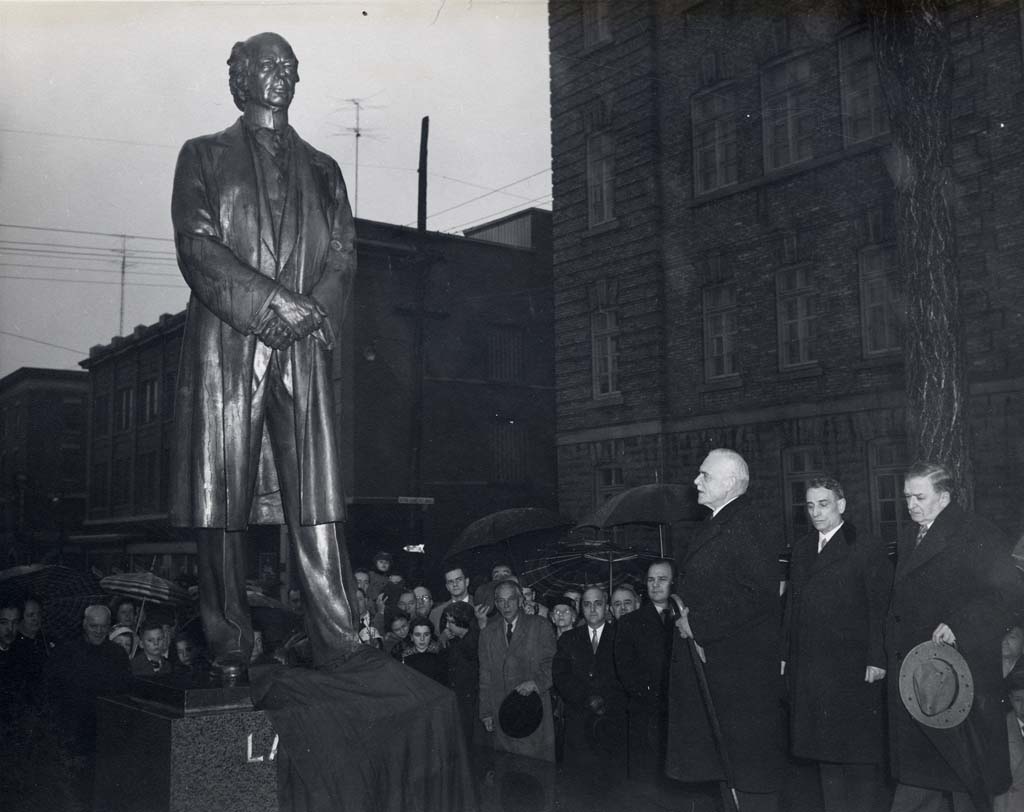 Dévoilement du monument Laurier en présence de Louis Saint-Laurent, Maurice Duplessis et Oscar Gilbert