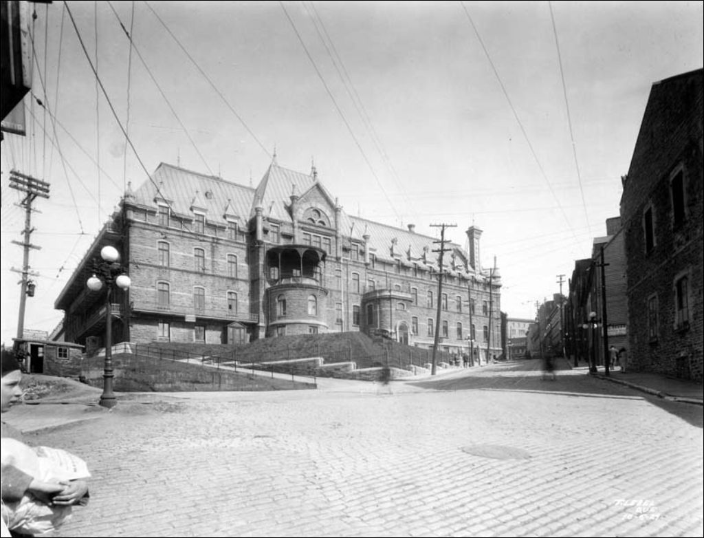 Quartier Vieux-Québec - Côte du Palais - Hôpital Hôtel-Dieu - Pavillon d'Aiguillon - Vue éloignée de la façade et du profil droit, 10 mai 1929, Archives nationales à Québec, Collection initiale, (03Q,P600,S6,D1,P297), Thaddée Lebel.