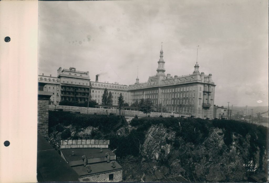 Quartier Vieux-Québec - Rue des Remparts à l’angle de la rue de l'Université - Université Laval - Vue prise sur la toiture d'une manufacture de la rue Sault-au-Matelot, 1928, Archives nationales à Québec, Collection initiale, (03Q,P600,S6,D1,P389), Thaddée Lebel.