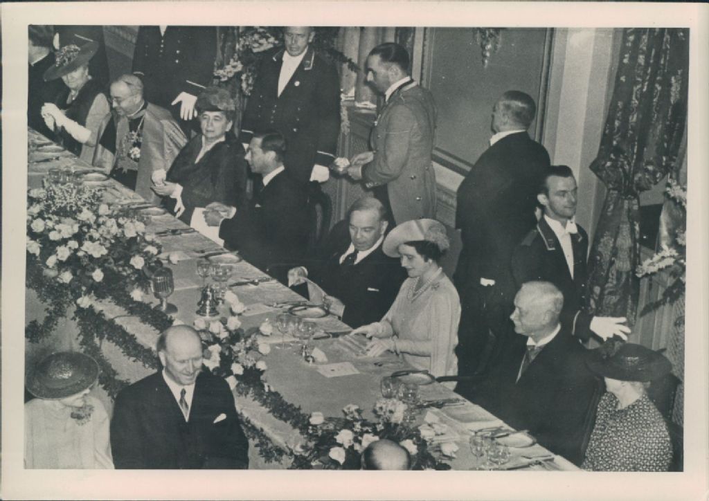 Dîner officiel offert par le gouvernement canadien au roi George VI et à la reine Élisabeth dans la salle de bal du Château Frontenac. À la table d'honneur Madame Patenaude, le cardinal Jean-Marie-Rodrigue Villeneuve, Madame Lapointe qui agissait comme hôtesse pour Monsieur King, George VI, William Lyon MacKenzie King, premier ministre du Canada, la reine Élisabeth, le lieutenant-gouverneur Ésioff-Léon Patenaude et T. A. Crerar, épouse du ministre des Ressources nationales fédérales