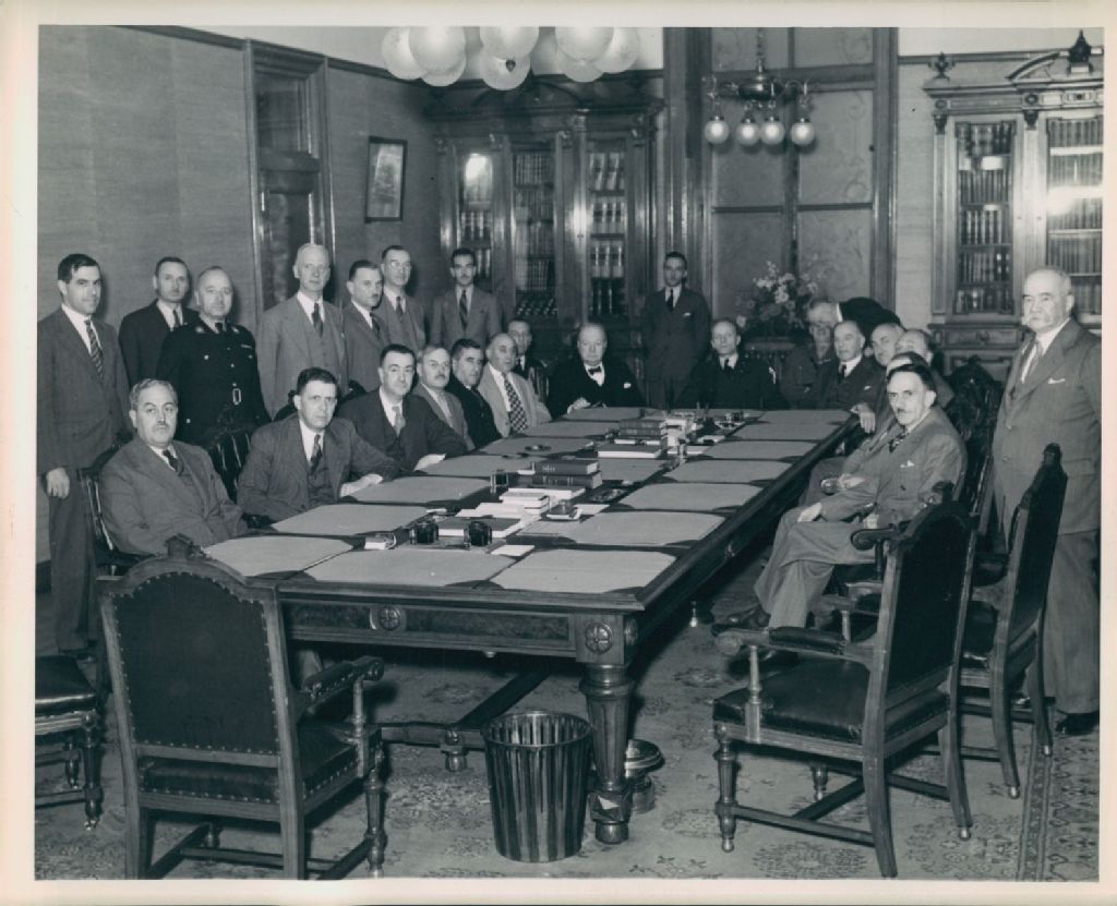 À la salle du Conseil Législatif Winston Churchill et Anthony Eden en présence de Valmore Bienvenue, Wilfrid Hamel, Henri Groulx, Edgar Rochette, Oscar Drouin, Télesphore-Damien Bouchard, Adélard Godbout, William Lyon Mackenzie King et Hector Perrier