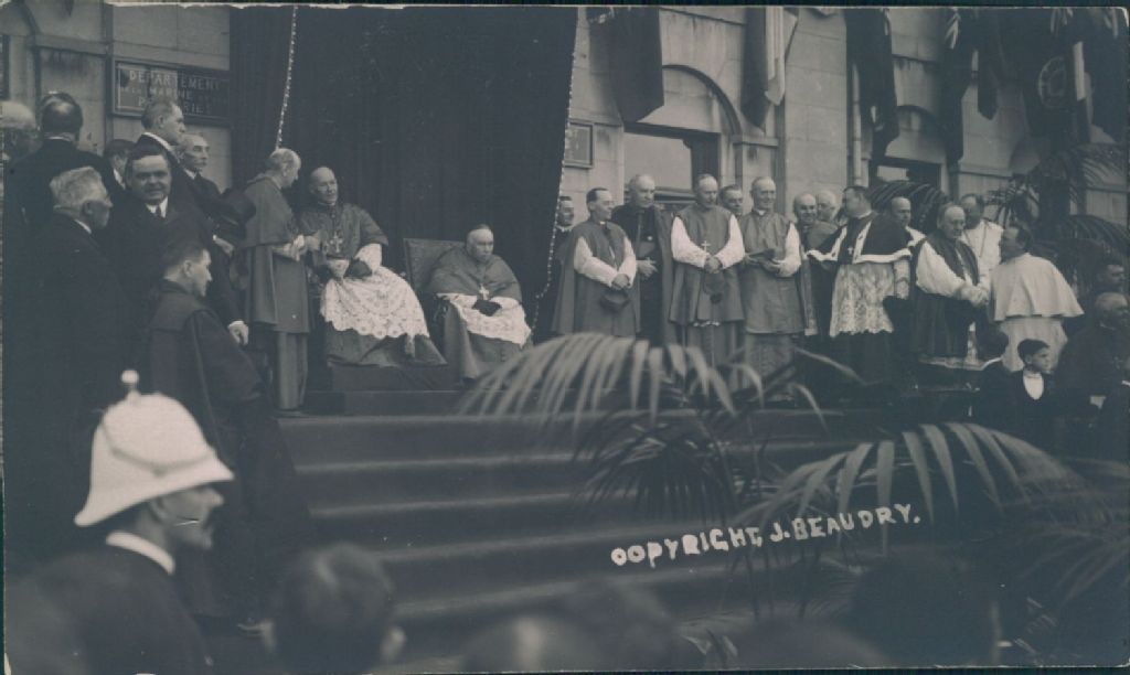Vue rapprochée des officiels, sous le dais érigé sur le parvis de l'édifice du Département de la marine et des pêcheries, lors de la visite de Vincent Vanutelli, aussi présents Lomer Gouin et Louis-Nazaire Bégin