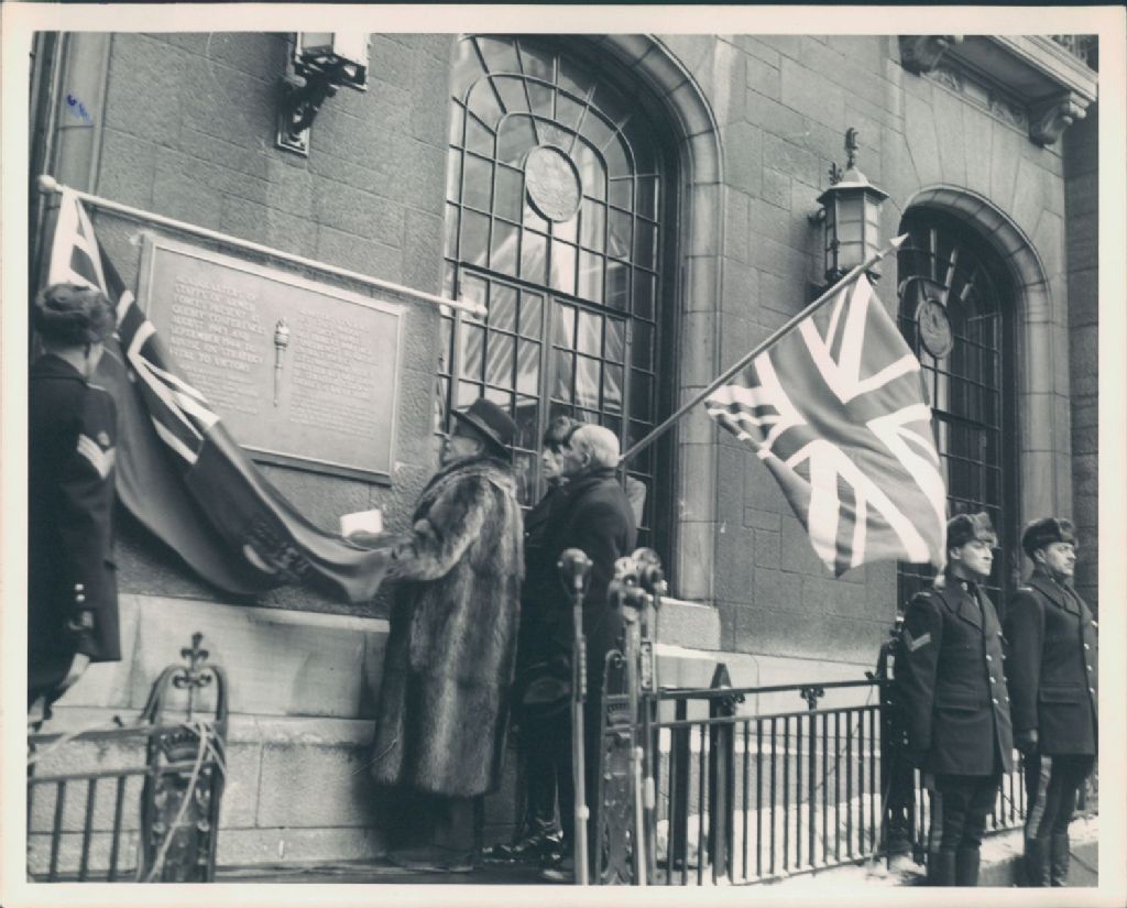Vue rapprochée du dévoilement de la plaque commémorative des Conférences de Québec août 1943 et septembre 1944, par Louis Saint-Laurent accompagné de D'Alton Corry Coleman, dans la cour intérieure de l'hôtel