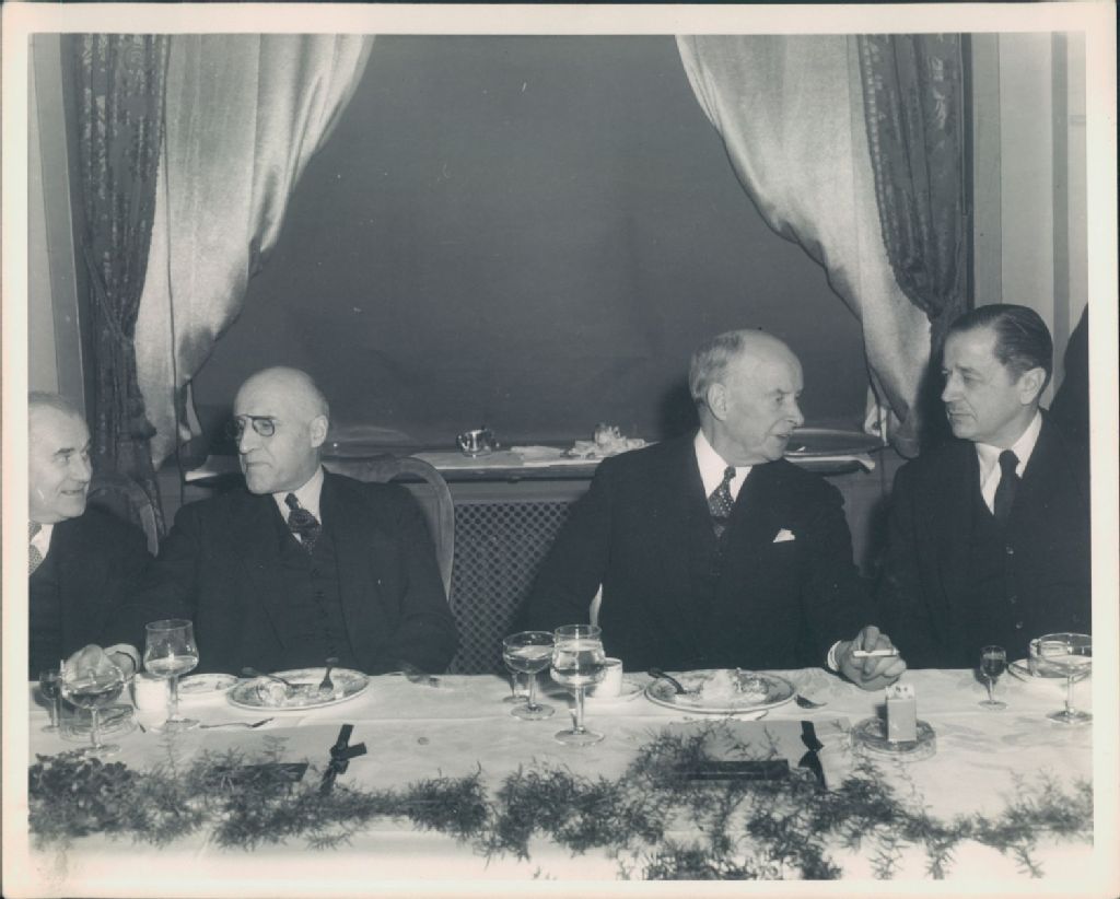 Vue rapprochée d'officiels à la table d'honneur, de gauche à droite ; J. A. Michaud, Inconnu, Albert Sévigny et Ray Atherton, lors du banquet offert par la compagnie du Canadien Pacifique, à l'occasion du dévoilement de la plaque commémorative des Conférences de Québec août 1943 et septembre 1944, à la salle de bal