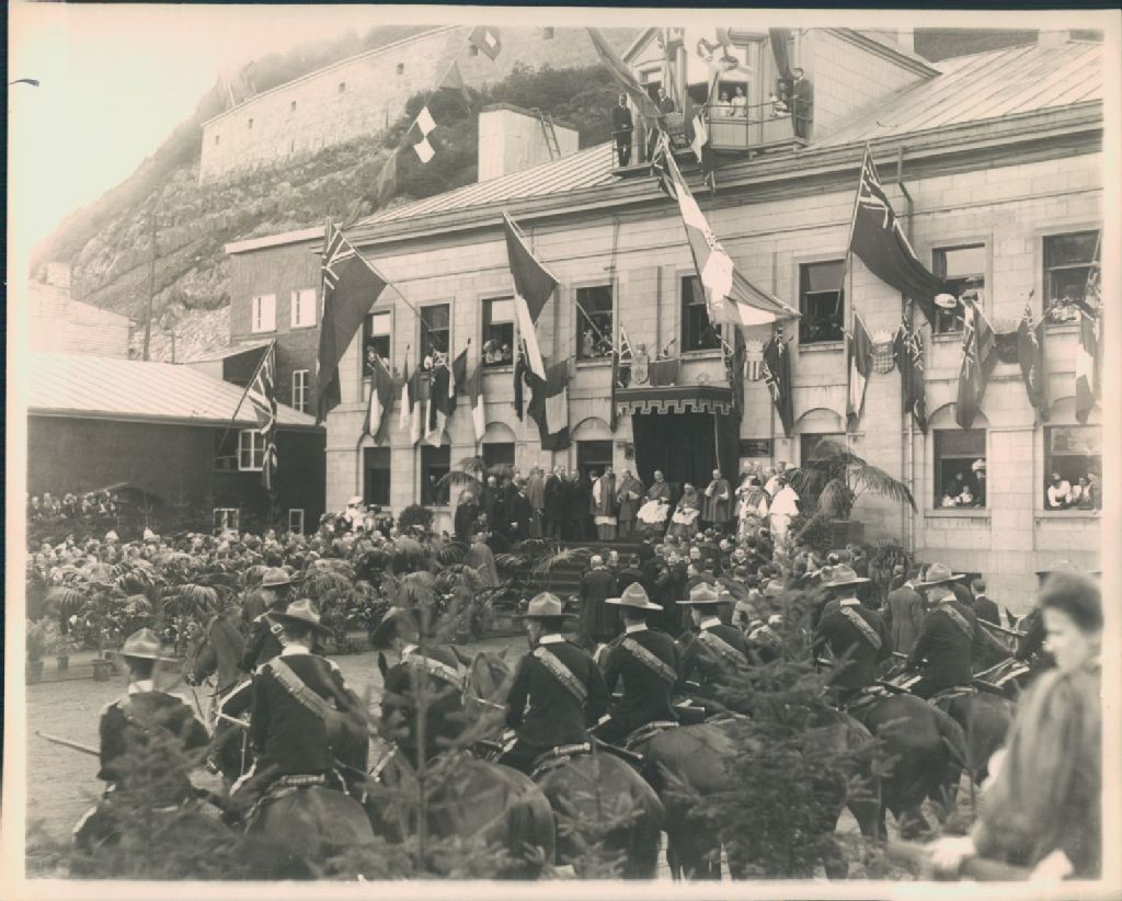 Vue éloignée du dais érigé sur le parvis de l'édifice du Département de la marine et des pêcheries, lors de la visite de Vincent Vanutelli, aussi présents Lomer Gouin et Louis-Nazaire Bégin