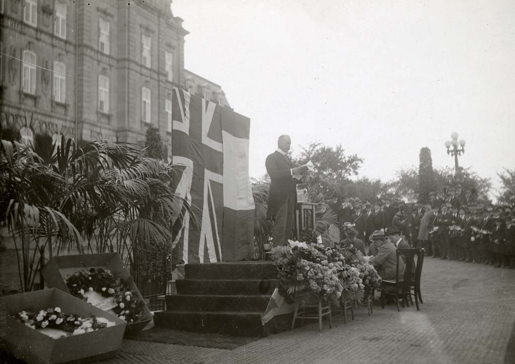 Quartier Saint-Jean-Baptiste - Avenue Honoré-Mercier - Parlement de Québec - Dévoilement du monument La Vérendrye - Plan rapproché de l'estrade officielle lors du discours
