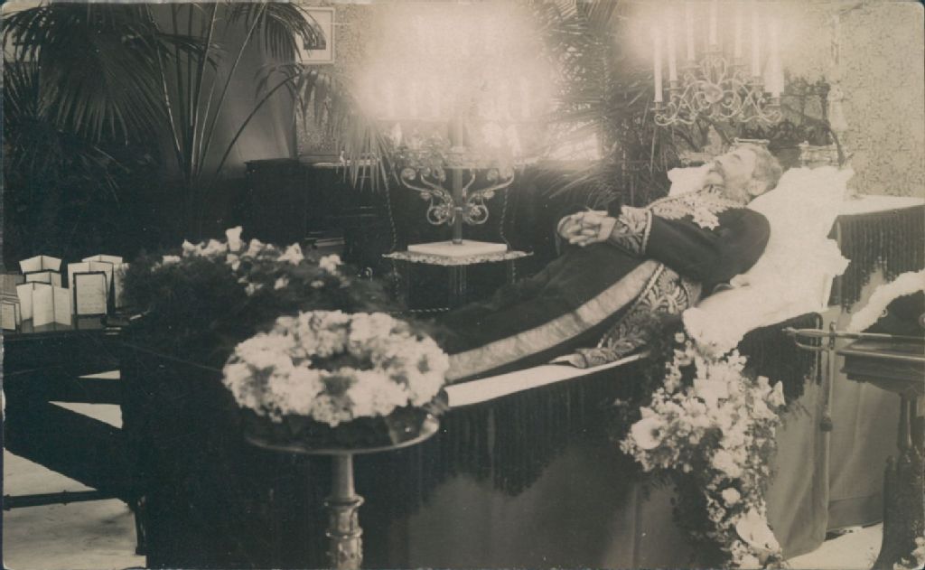 Vue rapprochée de la dépouille mortelle du lieutenant-gouverneur Charles-Alphonse-Pantaléon Pelletier, en chapelle ardente
