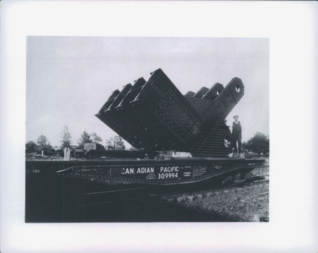 Vue éloignée des pièces de la structure du pont chargées pour le transport sur rail par le Canadian Pacific