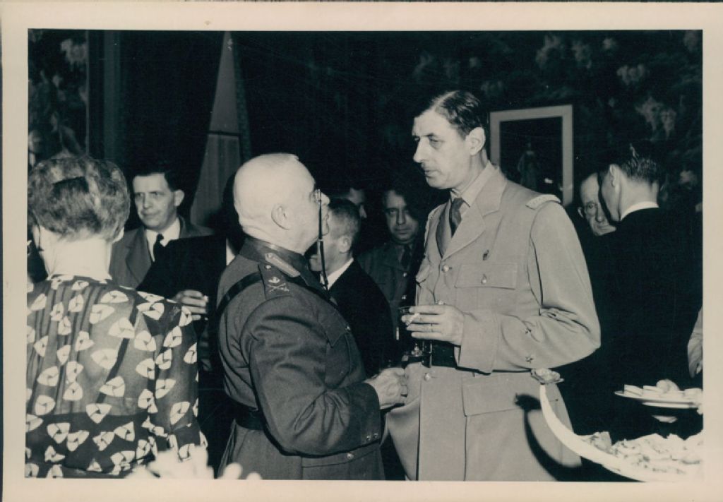 Vue rapprochée de Messieurs Charles De Gaulle et Eugène Fiset, à l'intérieur de la résidence, lors d'une réception