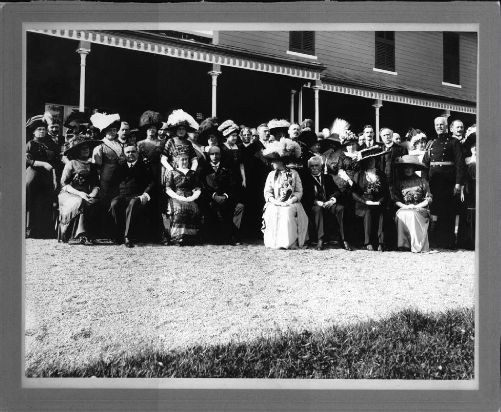 Vue rapprochée d'un groupe composé de madame Lomer Gouin, Lomer Gouin, Lady Grey, Lord Albert Harry George Grey, Lady Jetté et Sir Louis-Amable Jetté, devant la résidence, lors du tricentenaire de Québec
