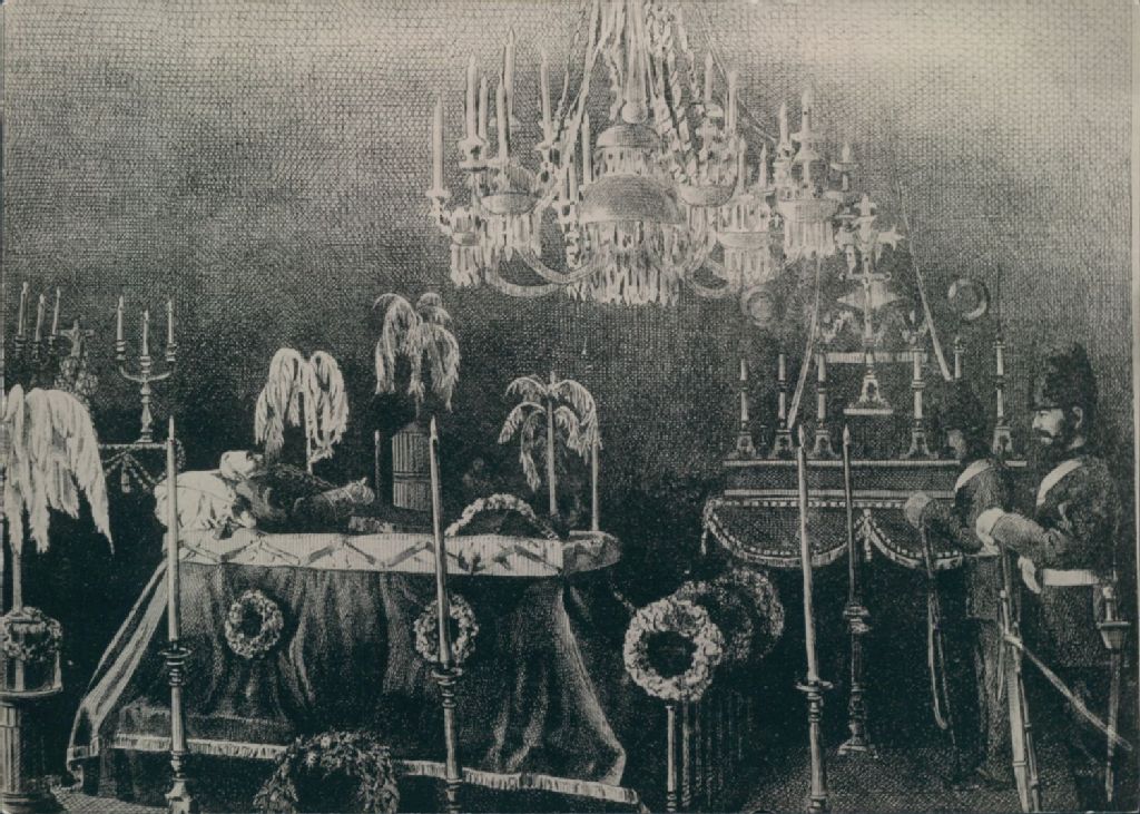 Reproduction photographique d'une gravure, représentant la dépouille mortelle du lieutenant-gouverneur R. E. Caron, en chapelle ardente