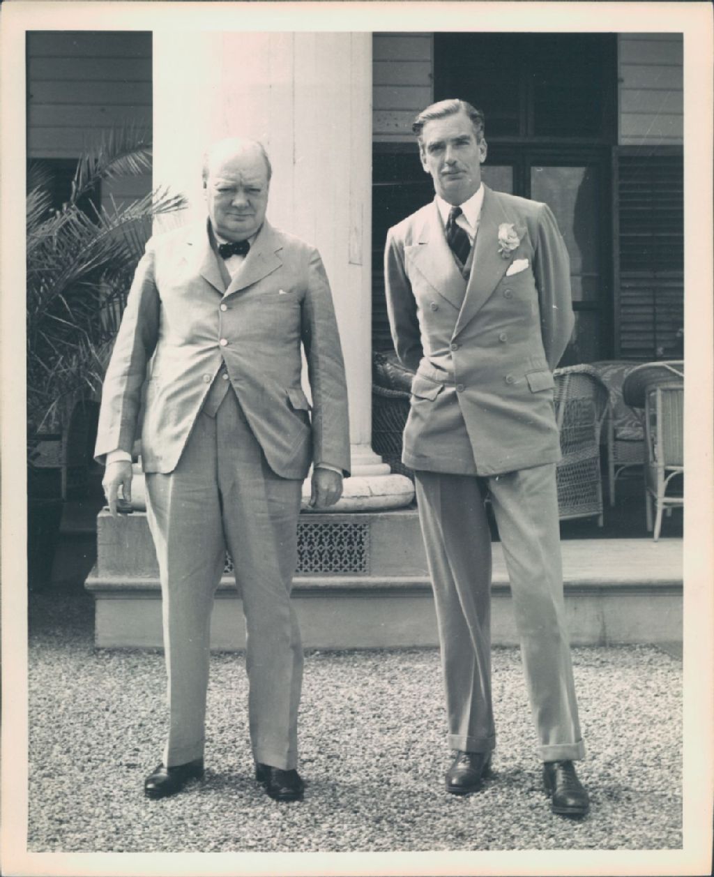 Vue rapprochée de Messieurs Winston Churchill et Anthony Eden, devant la résidence