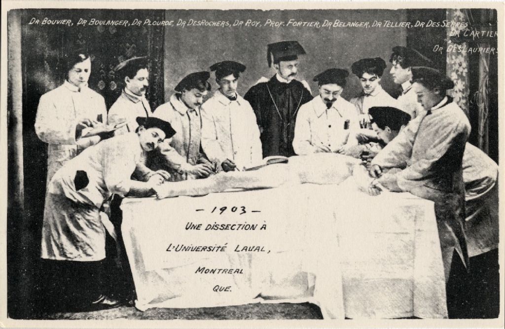 Vue d'un groupe d'étudiants en médecine, autour d'un cadavre pour une dissection, de gauche à droite: messieurs Bouvier, Boulanger, Desrochers, Roy, Dr Fortier (professeur), Bélanger, Tellier, Des Serres, Cartier et Deslauriers