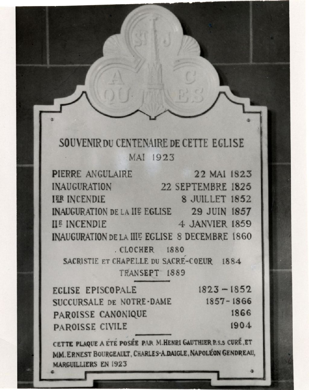 Montréal - Rue Saint-Denis angle Sainte-Catherine - Église Saint-Jacques - Plaque commémorative, [Vers 1925], Archives nationales à Québec, Collection initiale, (03Q,P600,S6,D4,P66), Edgar Gariépy.