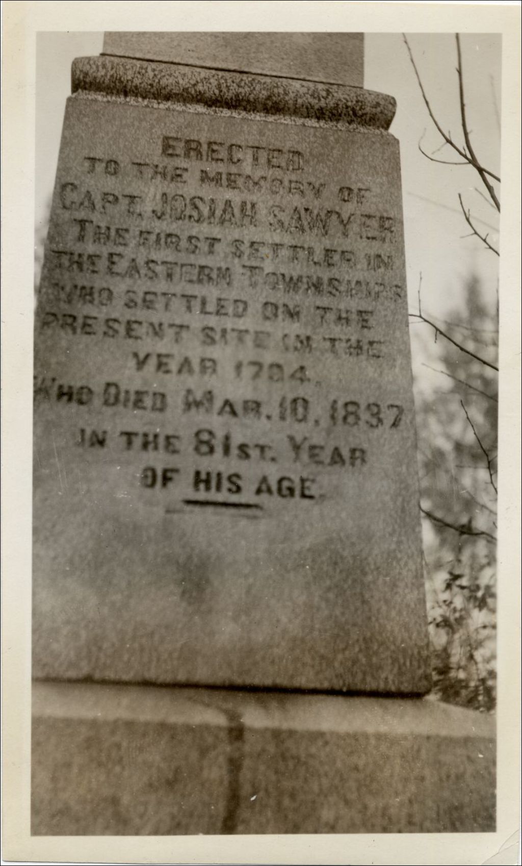 Sawyerville - Monument au capitaine Josiah Sawyer, [Vers 1920], Archives nationales à Québec, Collection initiale, (03Q,P600,S6,D5,P1097), Photographe non identifié.