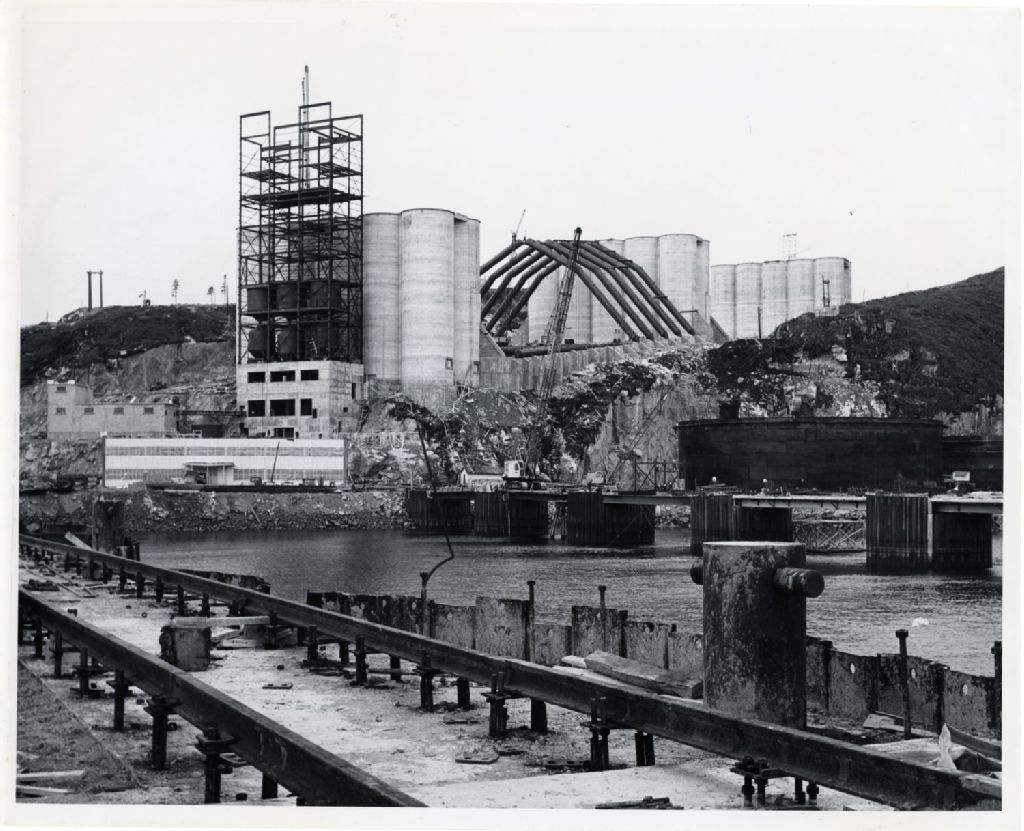 Vue prise du quai pendant les travaux de construction des silos à grain