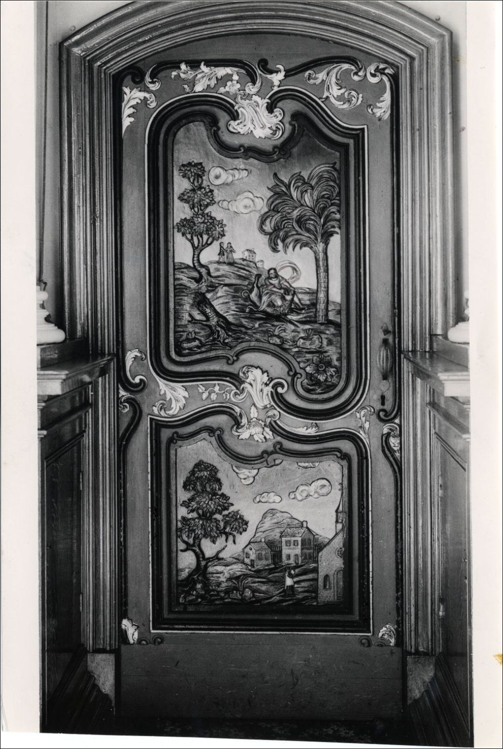 Vue rapprochée de la porte gauche de la sacristie, en bois sculpté, peint et doré