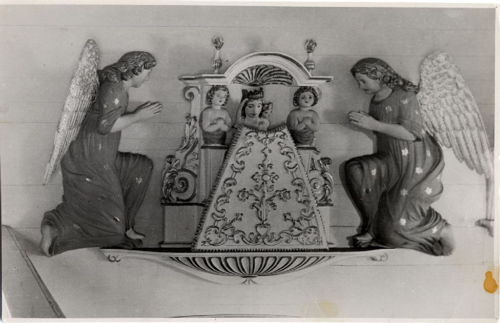 Vue rapprochée d'une sculpture en bois au-dessus de l'autel latéral gauche