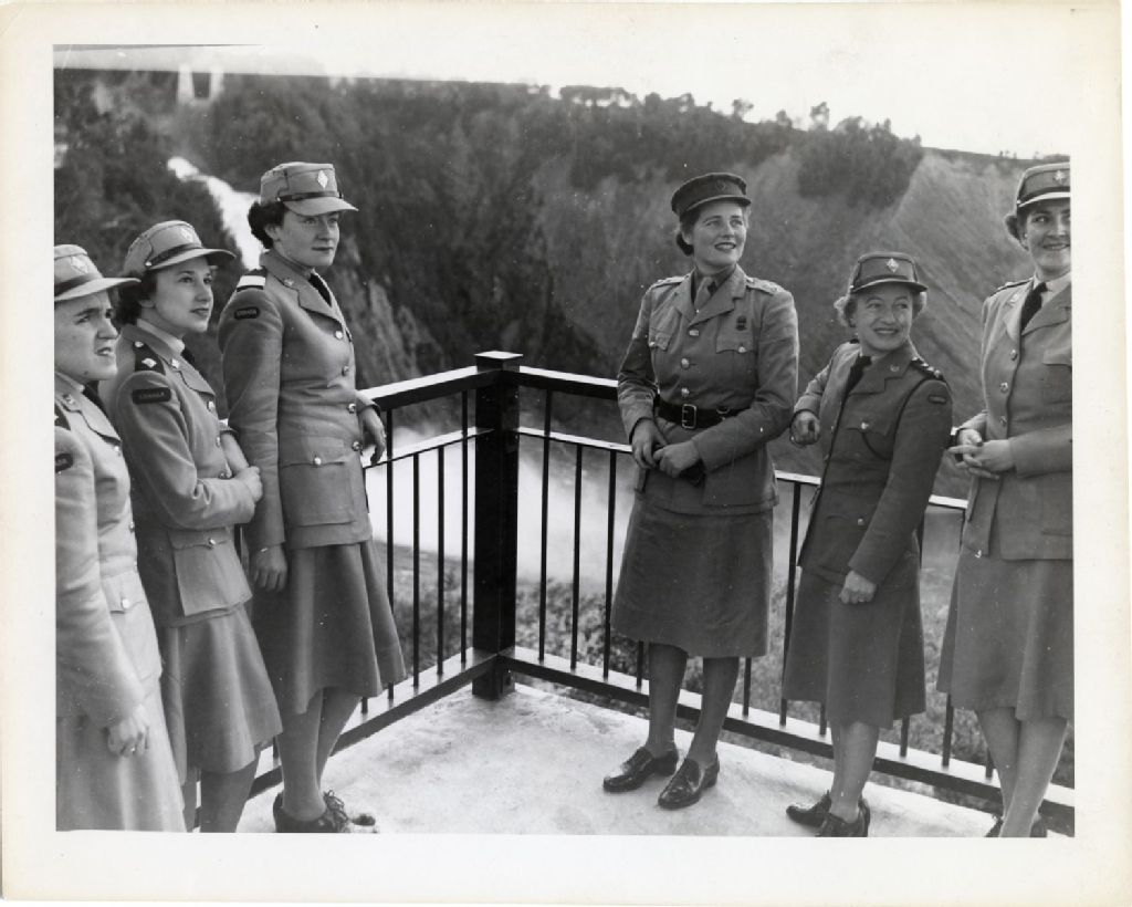 Vue rapprochée de mesdames Marie des Rivières, Pierrette Dupuis, C. Kernan, Mary Churchill, Marcelle Paradis et Carmen Murray, au belvédère sur le terrain du Kent House Hotel face à la chute, visite touristique lors de la Conférence de Québec