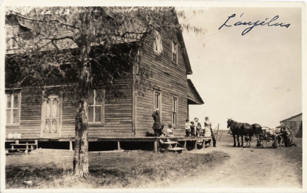 - Vue éloignée de la façade et du profil droit, à remarquer la présence sur la galerie, de la famille en prière dite avant les semailles