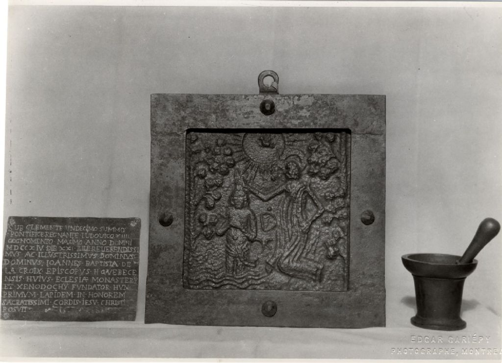 Vue rapprochée de gauche à droite: plaque en plomb de l'érection du premier monastère (1697); plaque de poêle en fonte des forges Saint-Maurice, représentant le baptême de Jésus par Saint-Jean-Baptiste; un pilon et mortier en fonte
