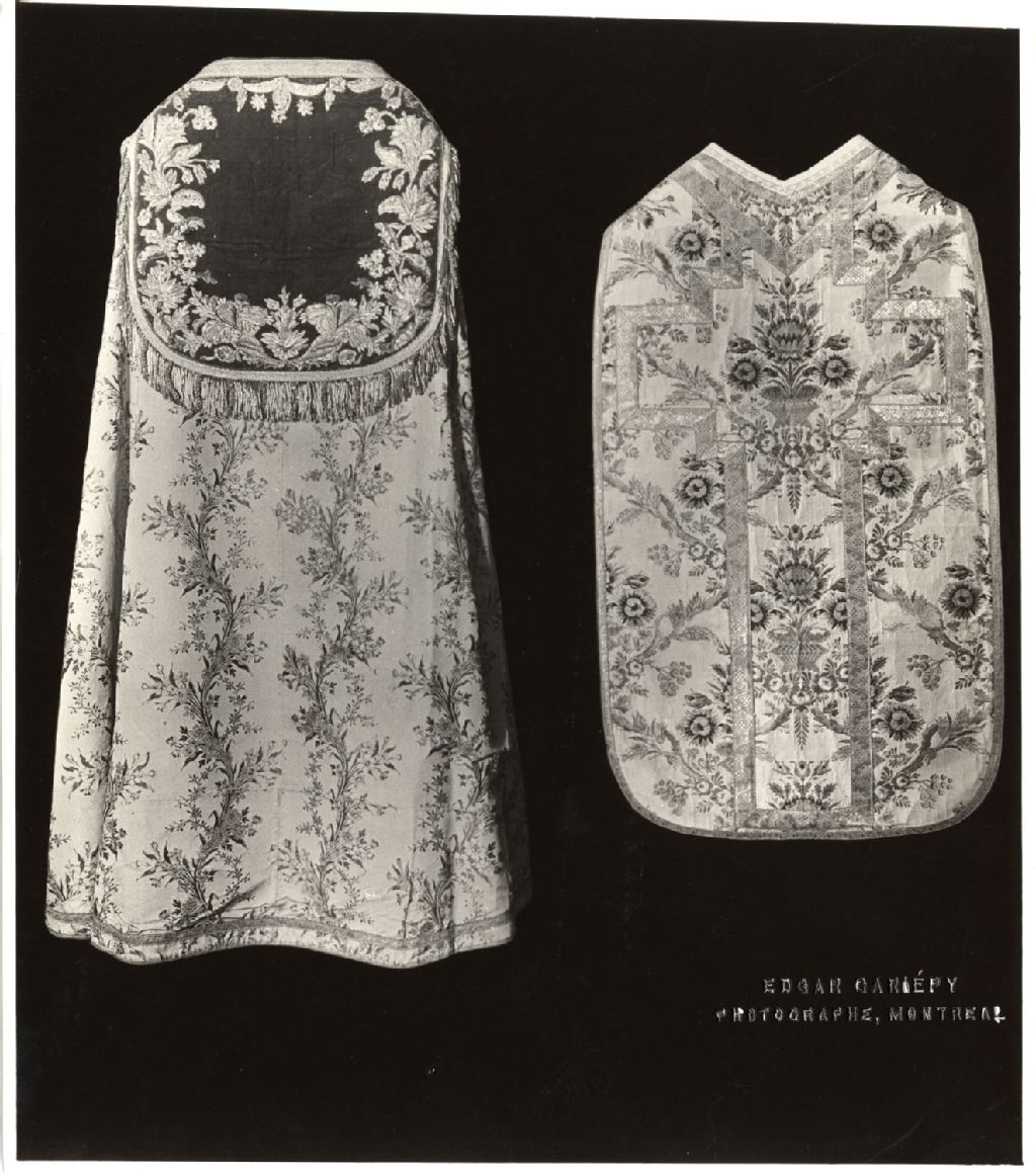 Vue rapprochée d'une chape et d'une chasuble données par Mgr Plessis