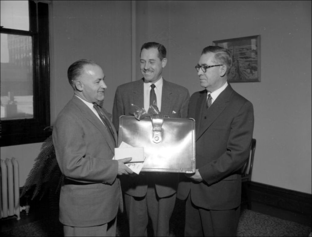 Présentation d'une malette à Henri Laperrière à l'occasion de sa retraite, 25 février 1959, Archives nationales à Gatineau, Fonds Champlain Marcil, (07H,P174,S1,D16391), Attribuée à Champlain Marcil.