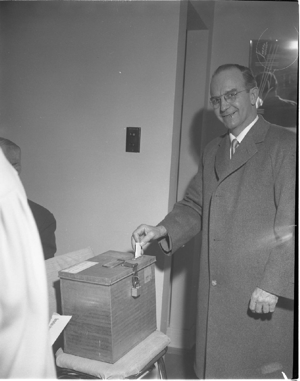 Armand Turpin déposant son vote dans une boîte de scrutin, 15 avril 1959, Archives nationales à Gatineau, Fonds Champlain Marcil, (07H,P174,S1,D16733), Attribuée à Champlain Marcil.