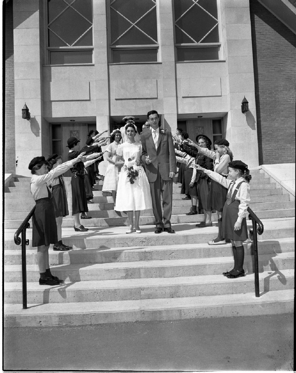 Mariage de Michelle Bruyère et de Robert Carr à l'église Sainte-Famille d'Ottawa, 11 juillet 1959, Archives nationales à Gatineau, Fonds Champlain Marcil, (07H,P174,S1,D17578), Attribuée à Champlain Marcil.