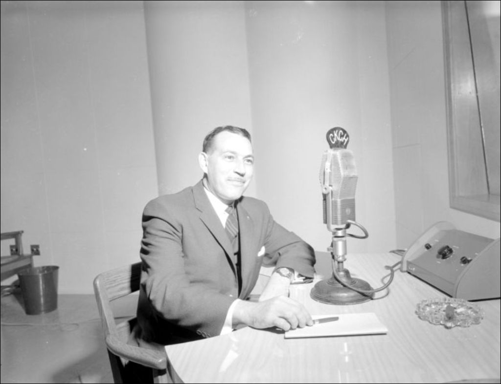 Oswald Parent au micro de la station radiophonique CKCH, 4 octobre 1960, Archives nationales à Gatineau, Fonds Champlain Marcil, (07H,P174,S1,D21180), Attribuée à Champlain Marcil.
