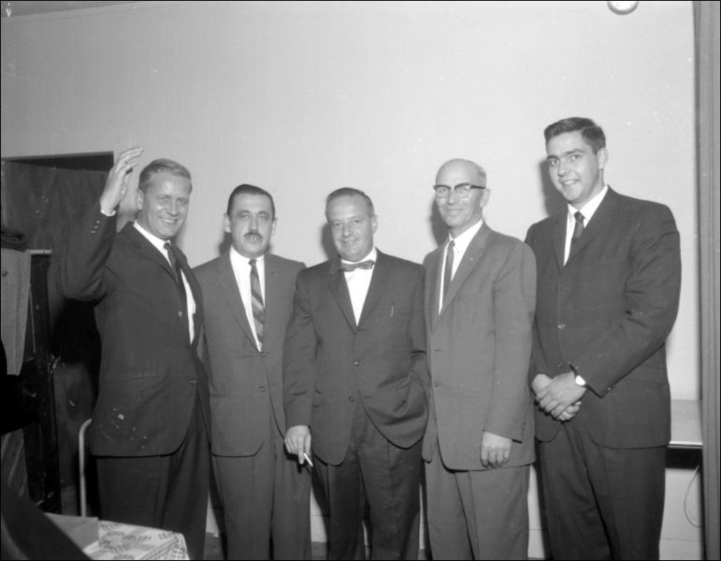 Cinq membres du Parti libéral du Québec pour le comté de Gatineau lors d'un congrès tenu à Farrelton, Québec, 7 octobre 1962, Archives nationales à Gatineau, Fonds Champlain Marcil, (07H,P174,S1,D28458), Attribuée à Champlain Marcil.