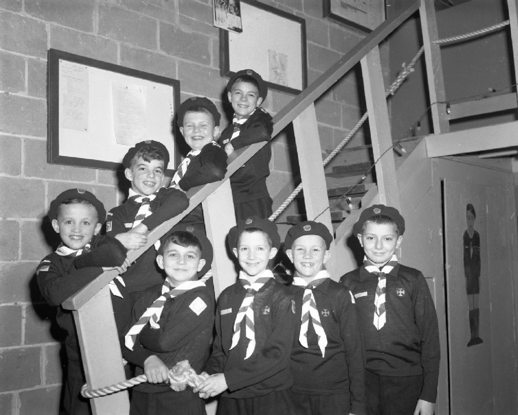 Investiture de Louveteaux de la paroisse Sacré-Coeur d'Ottawa, 13 décembre 1962, Archives nationales à Gatineau, Fonds Champlain Marcil, (07H,P174,S1,D29017), Attribuée à Champlain Marcil.
