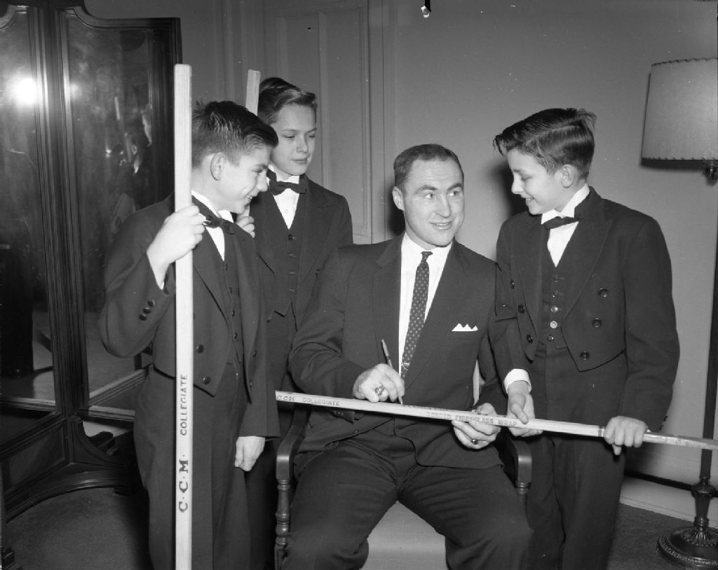 Présentation de bâtons de hockey par Red Kelly au parlement fédéral, 13 décembre 1962, Archives nationales à Gatineau, Fonds Champlain Marcil, (07H,P174,S1,D29018), Attribuée à Champlain Marcil.
