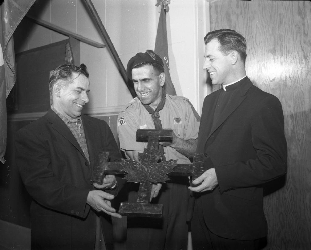 Remise d'une croix aux Scouts de la paroisse Saint-Charles de Vanier, 18 décembre 1962, Archives nationales à Gatineau, Fonds Champlain Marcil, (07H,P174,S1,D29068), Attribuée à Champlain Marcil.