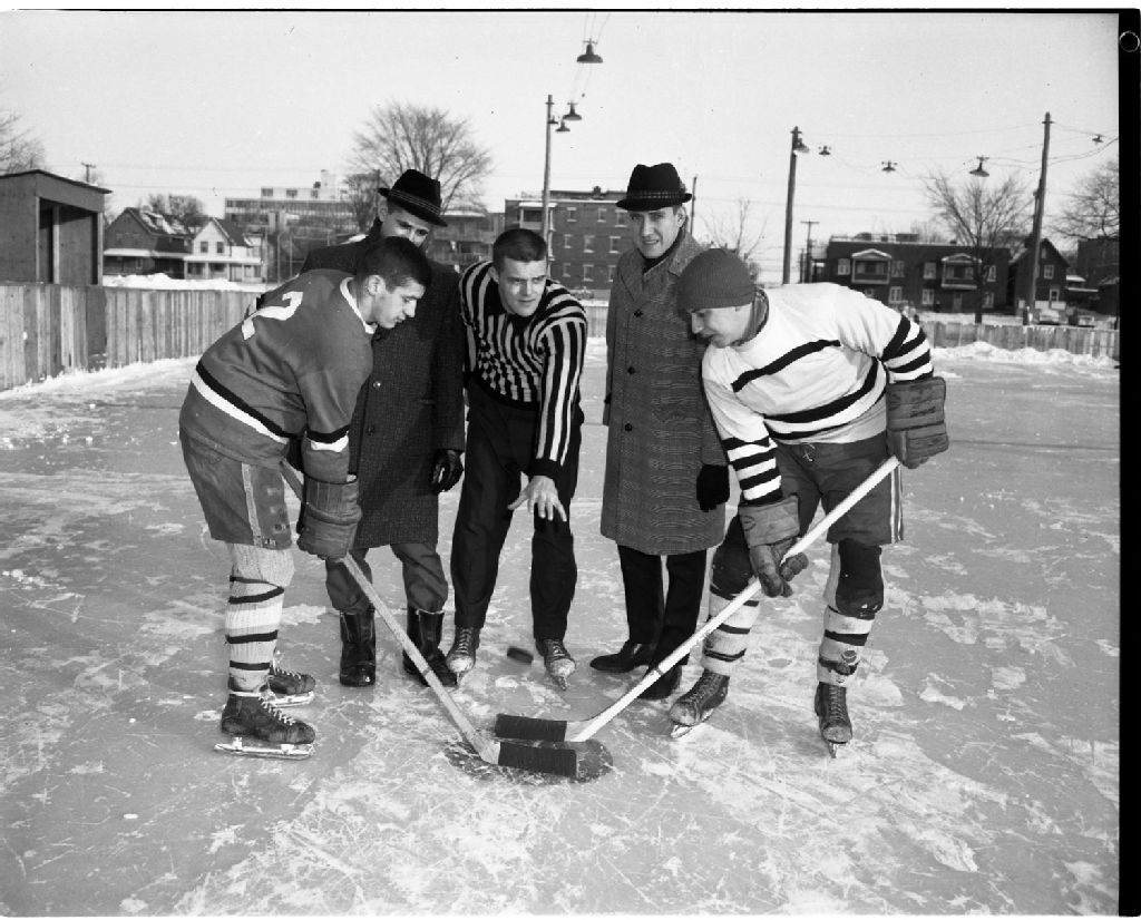 Ouverture ligue de hockey intermédiaire 4B Sacré-Coeur à l'École Reboul de Hull, 30 décembre 1962, Archives nationales à Gatineau, Fonds Champlain Marcil, (07H,P174,S1,D29141), Attribuée à Champlain Marcil.