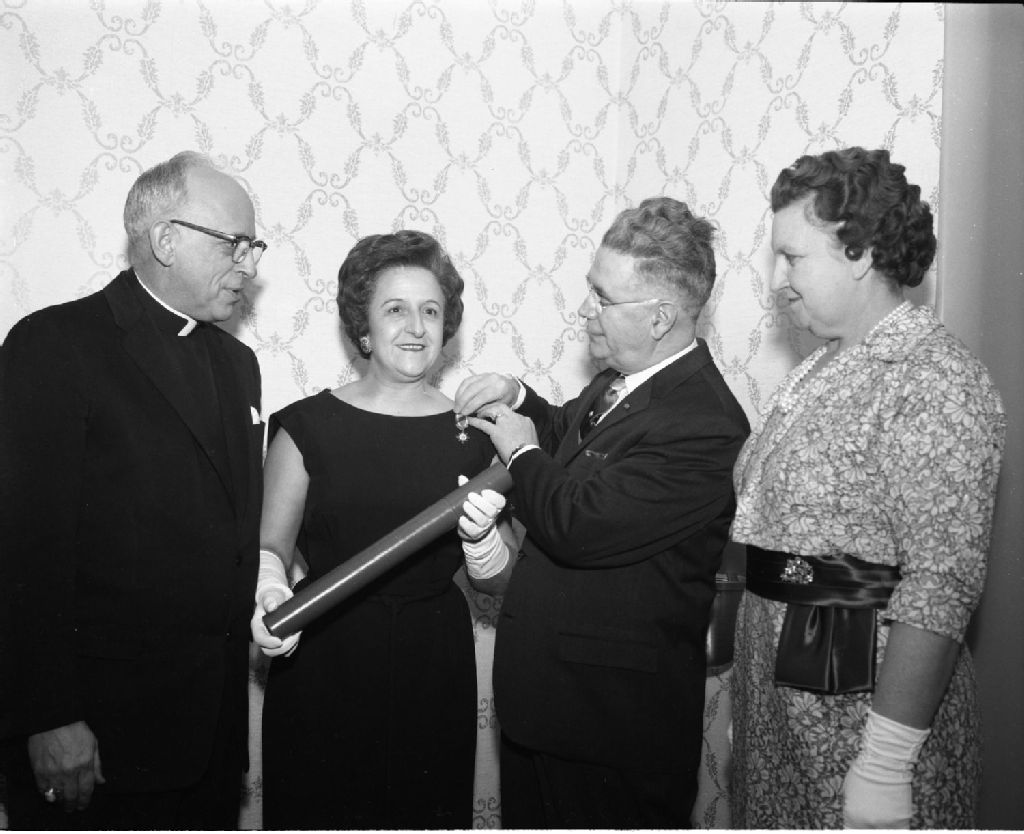 Remise de décoration à Mme Vaive lors du banquet annuel des institutrices, 19 janvier 1963, Archives nationales à Gatineau, Fonds Champlain Marcil, (07H,P174,S1,D29278), Marcil, Champlain.