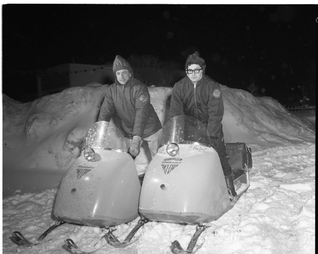 Jean Glazer et Calixte Pouliot arrivent de Maniwaki en motoneige, 27 janvier 1963, Archives nationales à Gatineau, Fonds Champlain Marcil, (07H,P174,S1,D29348), Marcil, Champlain.