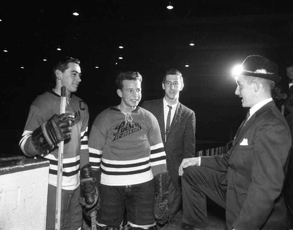 Claude Barrette, Roland Joubert, Claude Dubois et Yves Tremblay, joueurs de hockey, 20 février 1963, Archives nationales à Gatineau, Fonds Champlain Marcil, (07H,P174,S1,D29579), Marcil, Champlain.