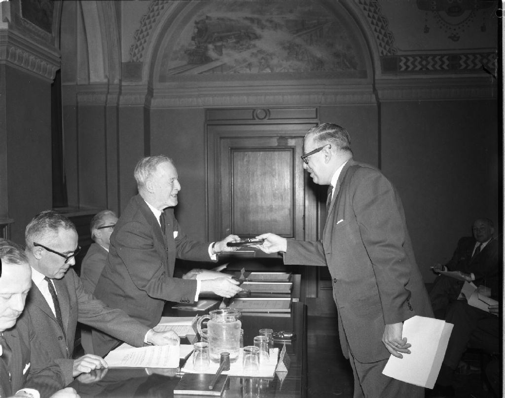 Présentation d'une plaque aux responsables de l'Imprimerie nationale, 1964, Archives nationales à Gatineau, Fonds Champlain Marcil, (07H,P174,S1,D29716), Marcil, Champlain.