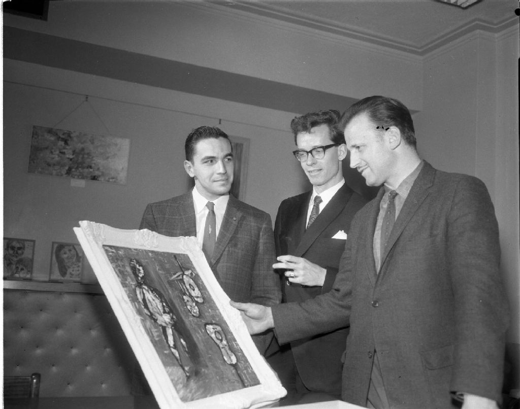 Présentation d'une peinture à la Faculté des arts de l'Université d'Ottawa, 1962, Archives nationales à Gatineau, Fonds Champlain Marcil, (07H,P174,S1,D29776), Marcil, Champlain.